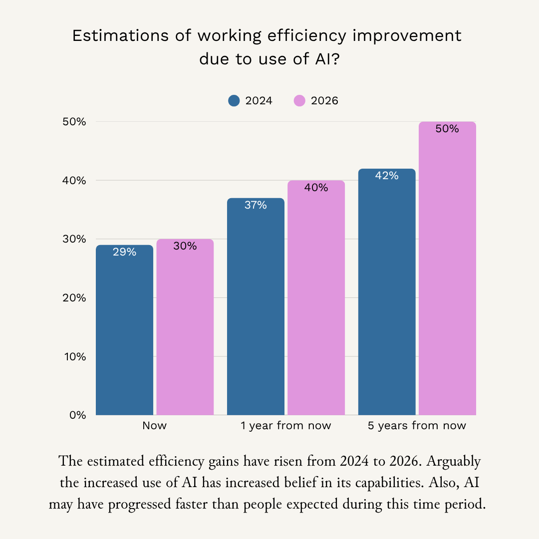 We asked this same question in May 2024. See the below image for the comparison. The estimated efficiency gains clearly rose from 2024 to 2026. The increased use of AI could have increased trust in its capabilities. Also, AI may have progressed faster than people expected during this time period.