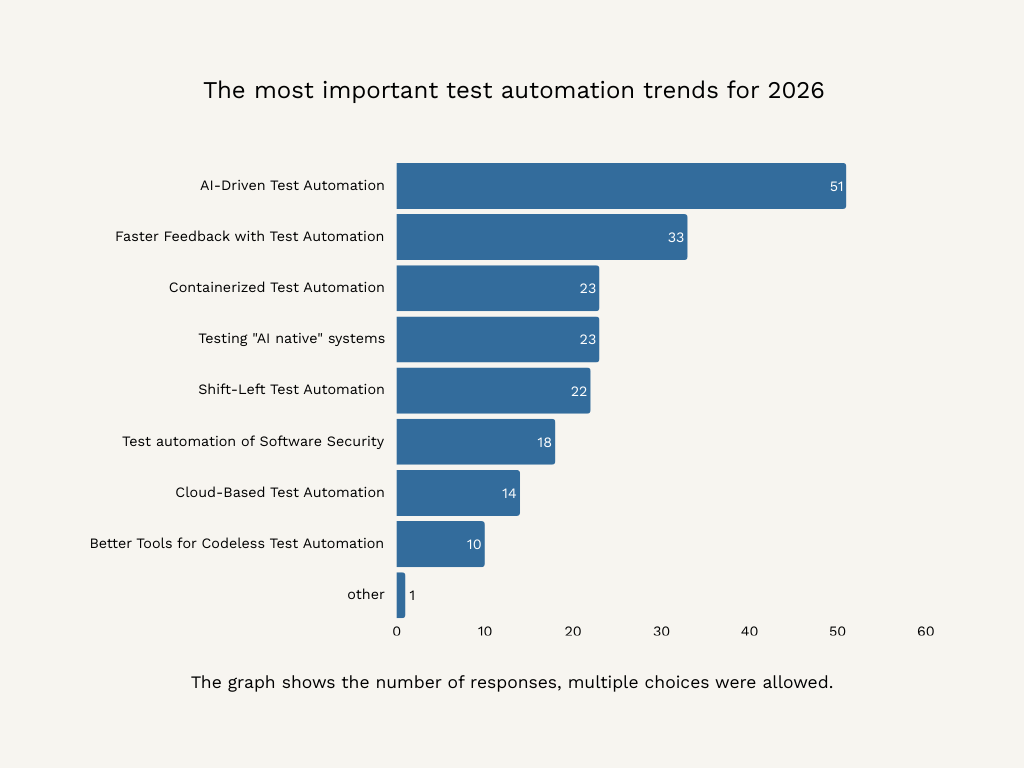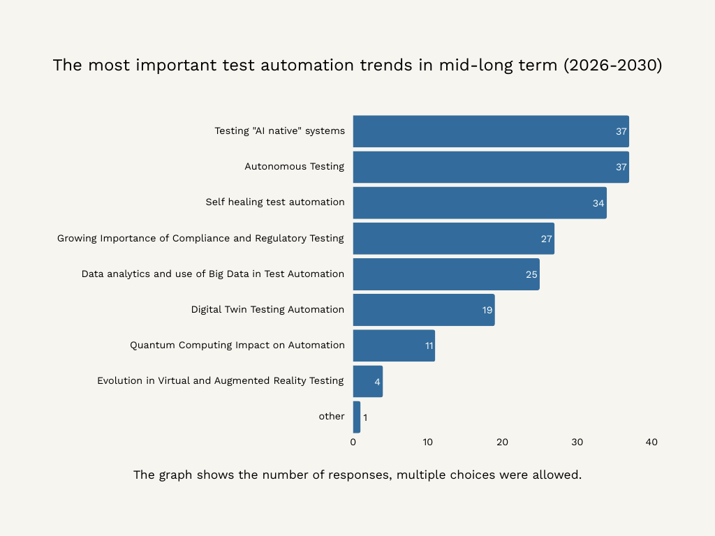 This is not a large academic study but a useful snapshot from people who work with test automation every day. In the survey we asked people’s opinions on trends for test automation in 2026, and separately for a longer time period 2026-2030. People could select multiple options, so the percentages don’t add up to 100%.