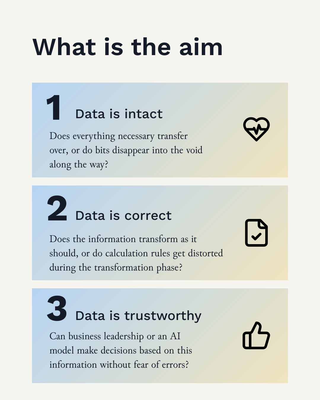 - Data is trustworthy: Can business leadership or an AI model make decisions based on this information without fear of errors?