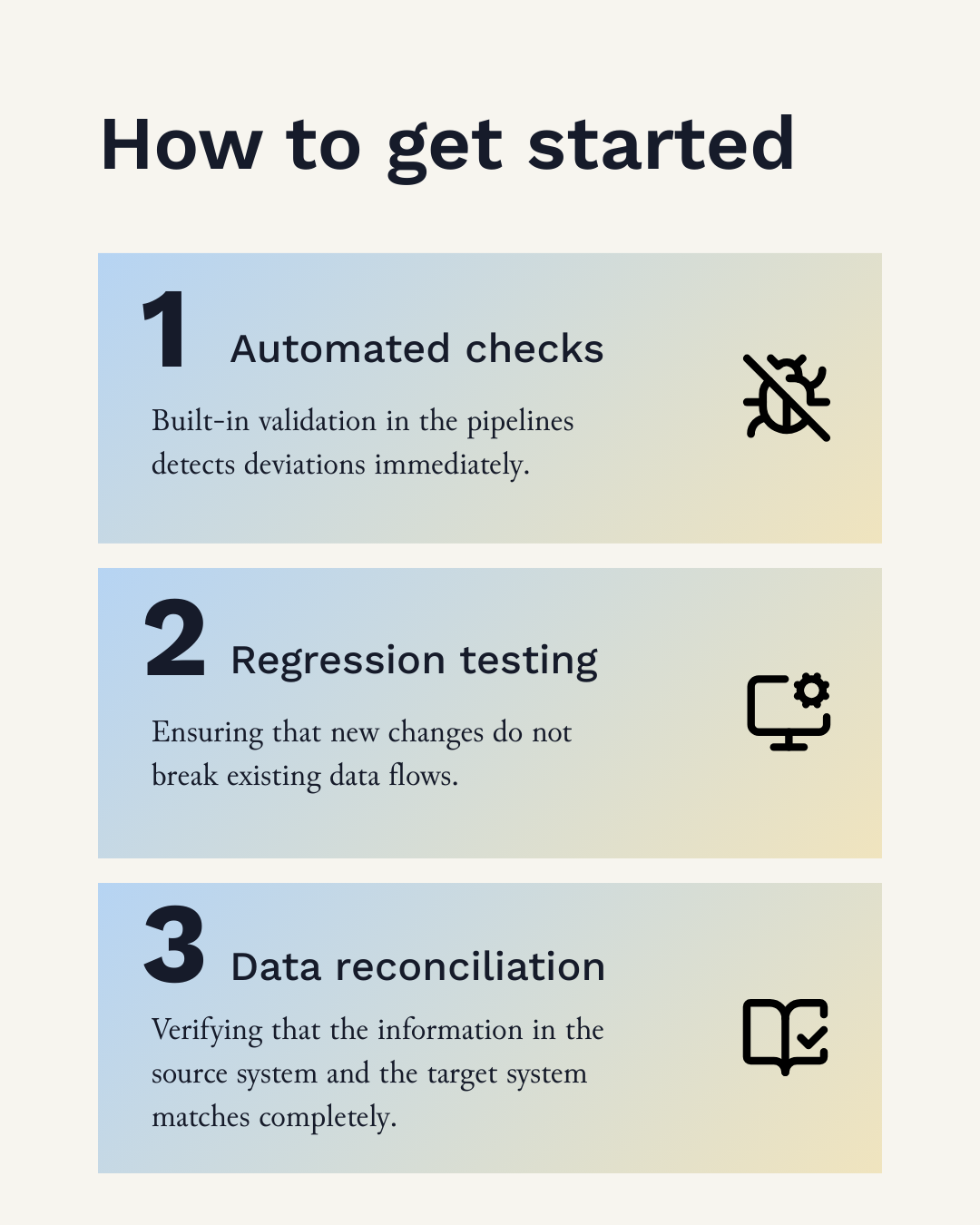 - Automated checks: Built-in validation in the pipelines detects deviations immediately.