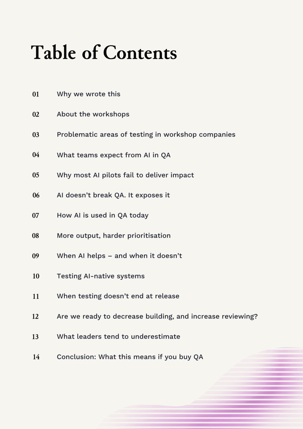 Kävimme 2026 alkuvuodesta yli 20 AI in QA workshopia asiakkaidemme kanssa, ja kirjoitimme näiden perusteella whitepaperin. Tämä vajaa 30 sivuinen tekele perustuu siis täysin tosielämän tilanteisiin alkuvuodesta 2026. Whitepaper vastaa mm. kysymyksiin mikä toimii, mitä asiakkaamme ovat kokeilleet, mikä ei toimi ja mikä erityisesti hankaloittaa AIn hyödyntämistä.