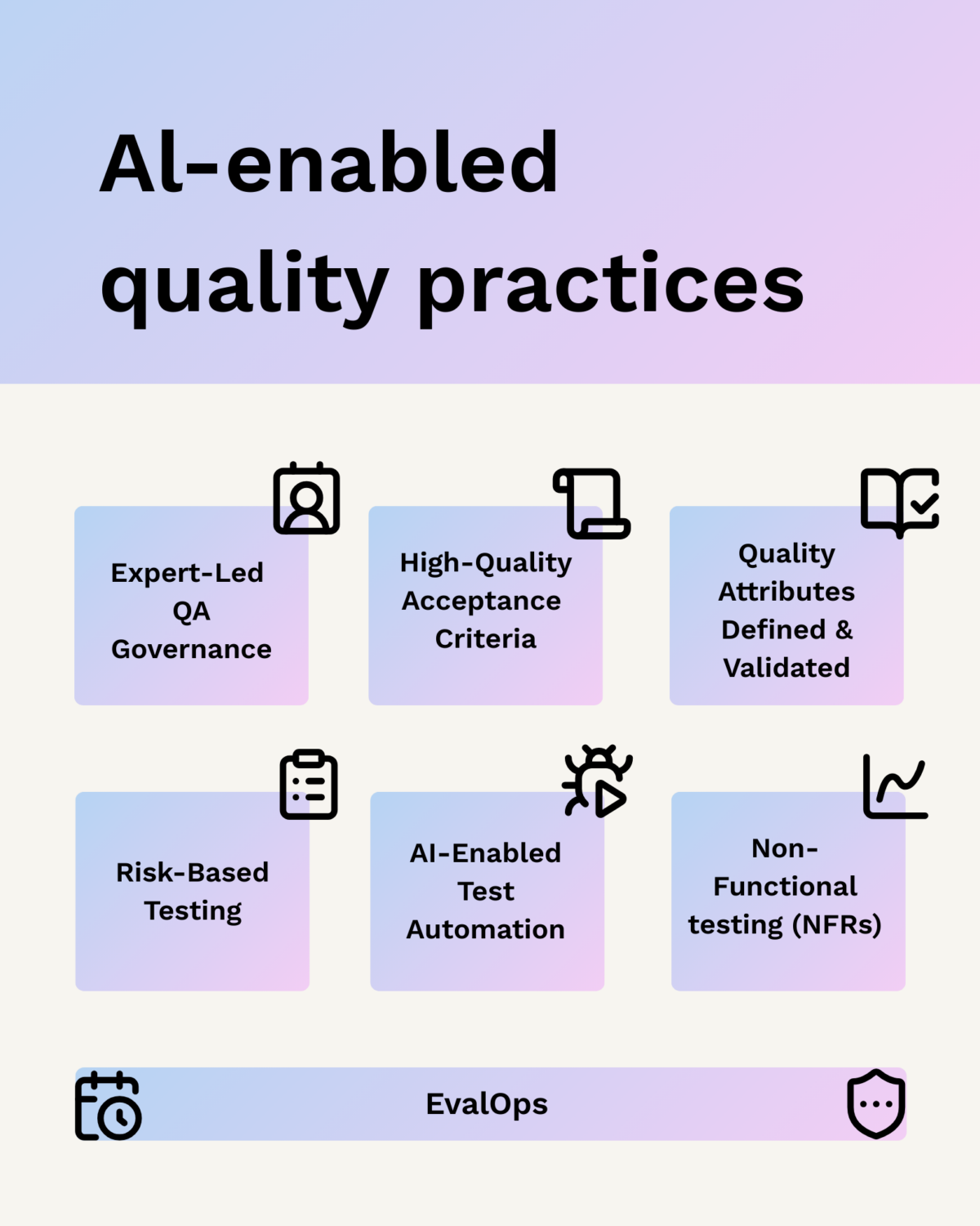 AI-aikakaudella QA:n merkitys korostuu entisestään: selkeät hyväksymiskriteerit ohjaavat nyt ihmisten lisäksi tekoälyagentteja. Laatuvaatimukset, kuten tietoturva ja suorituskyky, on määriteltävä heti alussa, jotta ne ohjaavat tekoälyn tuottamia ratkaisuja oikeaan suuntaan. EvalOps täydentää kokonaisuuden tuomalla laadunvarmistuksen jatkuvaksi palauteloopiksi, joka mahdollistaa tekoälymallien käytöksen mittaamisen ja parantamisen kehityksen jokaisessa vaiheessa.